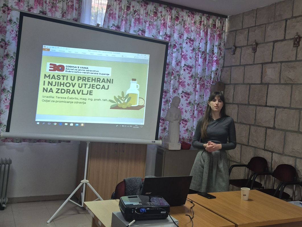 U sklopu gerontopredavanja Zavoda za javno zdravstvo DNŽ, mag. ing. prehrambene tehnologije Tereza Čabrilo održala je predavanja na temu „Masti u prehrani i njihov utjecaj na zdravlje“.